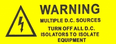 2012 Complete set of solar grid connect system labeling engraved Traffolyte compling with Australian Standards AS5033 2012. Labels go through updates and changes through Local Supply Authority requirement and by the Institute of Electrical Inspectors in conjunction with Australian Standards and Energy Safe Victoria. Please ensure before purchasing that these labels meet appropriate state electricity distributor regulations. It is advisable that installers use silicone or LOCKTITE 404 glue for better adhesive or bonding between plastic and trafolyte, especially if labels are installed outdoor , double sided tape with time and outdoor weather will come off if surface bonding is not cleaned. Additional WARNING label sold separately from kit